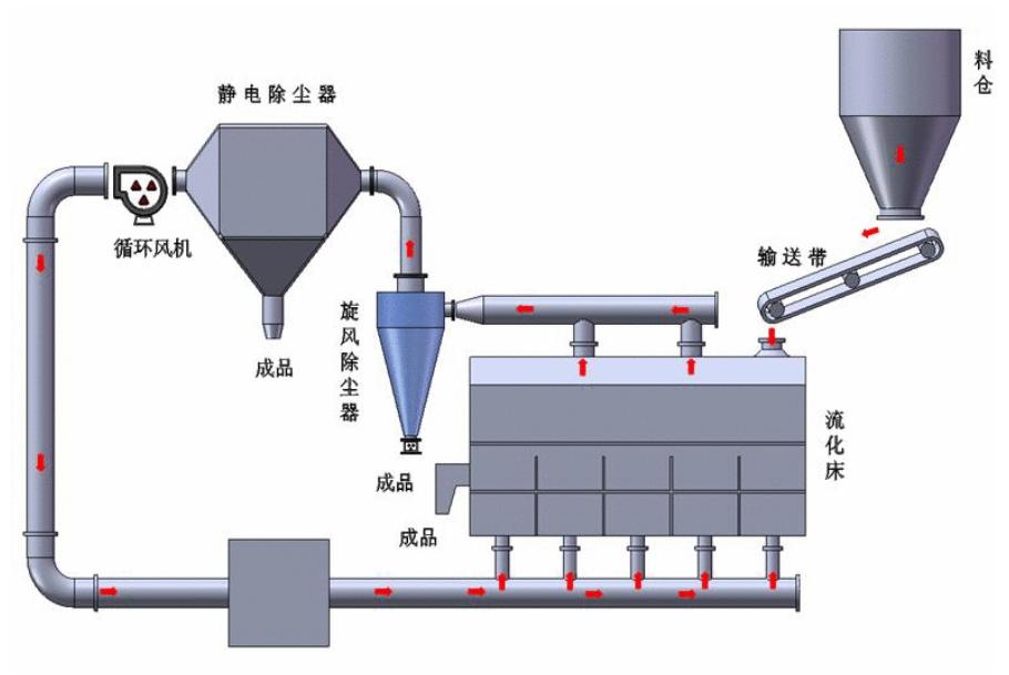 流化床干燥设备是一种高效的干燥设备,适用于无凝聚作用的散粒状物料的干燥。其工作原理是湿物料进入流化床内与热空气接触,形成流化状态,使物料颗粒与热空气充分混合,进行强烈的传热和传质,从而脱除水分,达到干燥效果。合格的产品由流化床的出料口排出,含尘气体则经过除尘装置净化后排放。